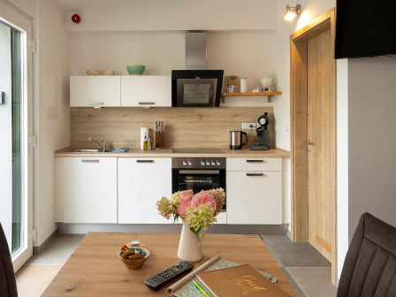 Unsere barrierefreien Ein-Raum-Appartements mit eigenem Bad sind im Wohn-/Essbereich mit einer gemütlichen Sitzecke sowie einem Sat-TV ausgestattet. Eine Küchenzeile ist ebenfalls vorhanden. Für einen erholsamen Schlaf steht ein großes Boxspringbett für Sie bereit. Jedes Appartement verfügt über eine eigene Terrasse mit Sitzmöglichkeiten.